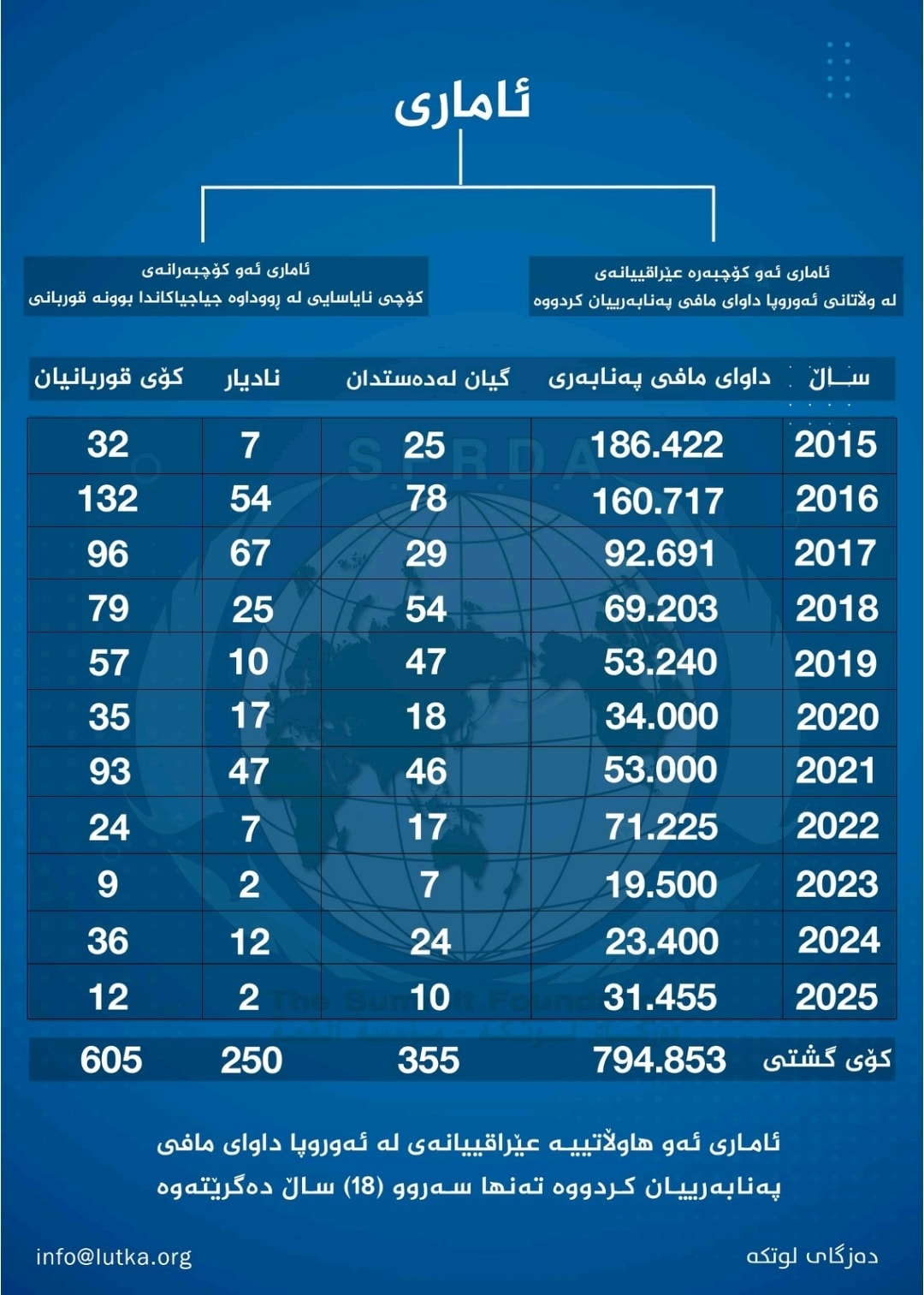 دەزگاى لوتکە ئامارى ١١ ساڵى پەنابەرانى بڵاو کردووەتەوە، بەپێى ئامارەکە ٧٩٤٨٥٣ هاووڵاتیى عێراق و هەرێمى کوردستان لە وڵاتانى ئەورووپا داواى مافى پەنابەرێتییان کردووە، ژمارەى قوربانییانیش ٦٠٥ کەس بووە کە ٣٥٥ کەسیان تەرمەکانیان دۆزراوەتەوە و ٢٥٠ کەسیش هێشتا بێسەروشوێنن.